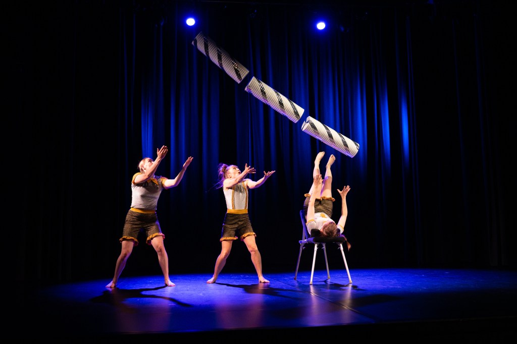 Trioakrobatiaan yhdistyy esityksessä teatterillisuus, tarinallisuus, tanssillisuus ja jalkajongleeraus.