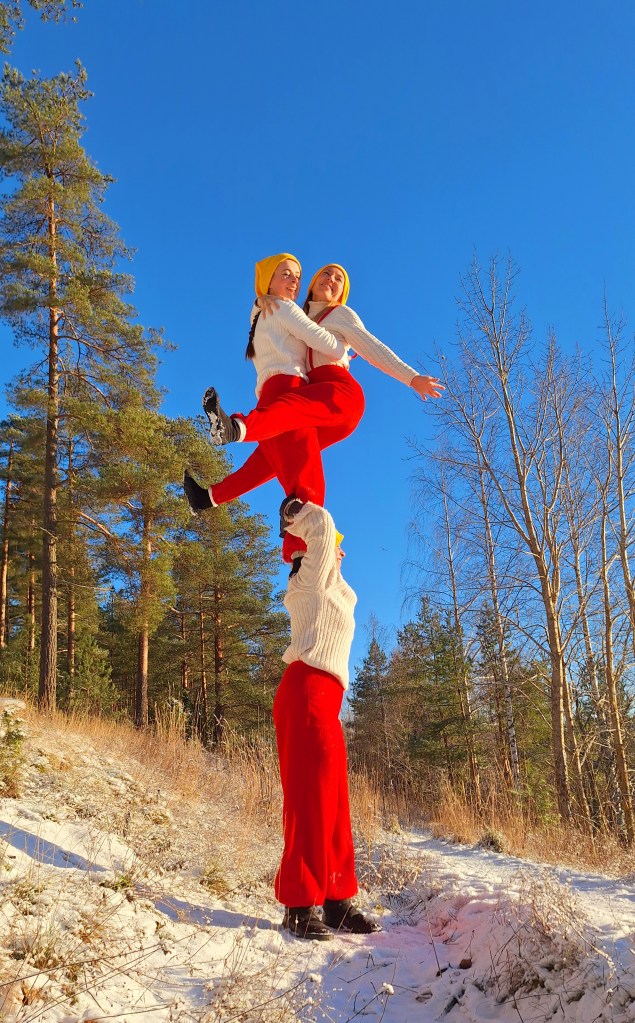 Talvinen sirkusseikkailu, joka on suunniteltu ulkona nautittavaksi, pihalle tai leikkipuistoon mahtuvaksi.